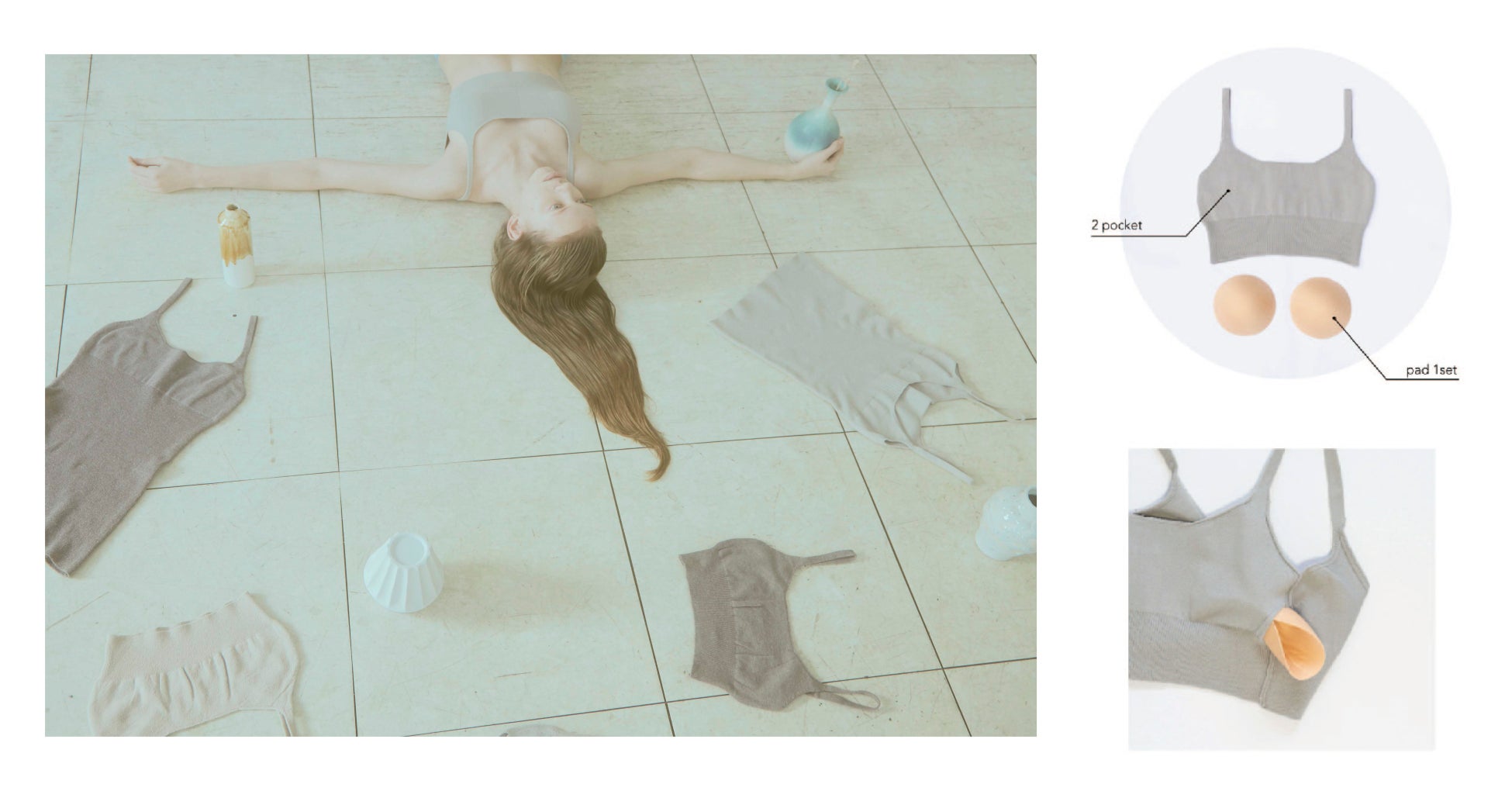 nakesのニットブラには全てパッドを差し込めるポケットが編み地だけで作られており、快適な着心地を実現。服として楽しめるデザインと着心地が両立されています。