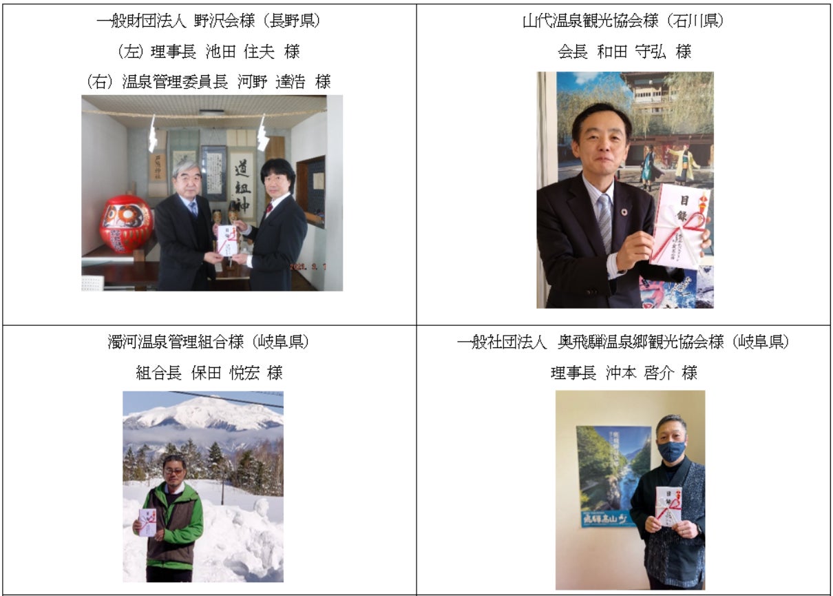 当社では、新型コロナウイルス感染症に起因する観光客の減少によって、温泉地や温泉地周辺の観光地がダメージを受ける中、「日本の名湯」をご公認いただいている温泉地の活性化や支援の一助になればと考え、「日本の名湯」の売上げの一部を寄付するプロジェクトを行っております。