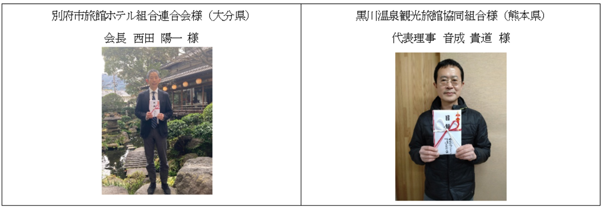 「第3回の寄付金贈呈ありがとうございます。そろそろコロナも明けて、少しずつ以前のような生活に近づいてきていると感じています。皆様には温泉と自然を満喫しに是非お越しください。頂戴しました寄付金は、湯原温泉の泉質などを皆様に知って頂ける取り組みに使わせていただきます。」(湯原町旅館協同組合様)