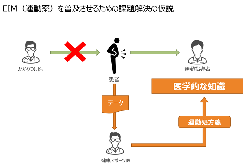 生活習慣病患者は運動能力(持久力)が低いと相対的に死亡リスクが高まる事から、運動無関心層に運動を促す事が大切で、その上で「医師による声掛け」は効果的ですが、医師は運動の専門家ではないため、運動の内容を具体的に指導する事はできません。そこでコガソフトウェアでは健康スポーツ医(※1)が個人に適切な運動量を処方する運動療法「EIM(運動薬・運動処方※2)」に着目。それを促進するヘルスケアDXシステムを構築いたしました。