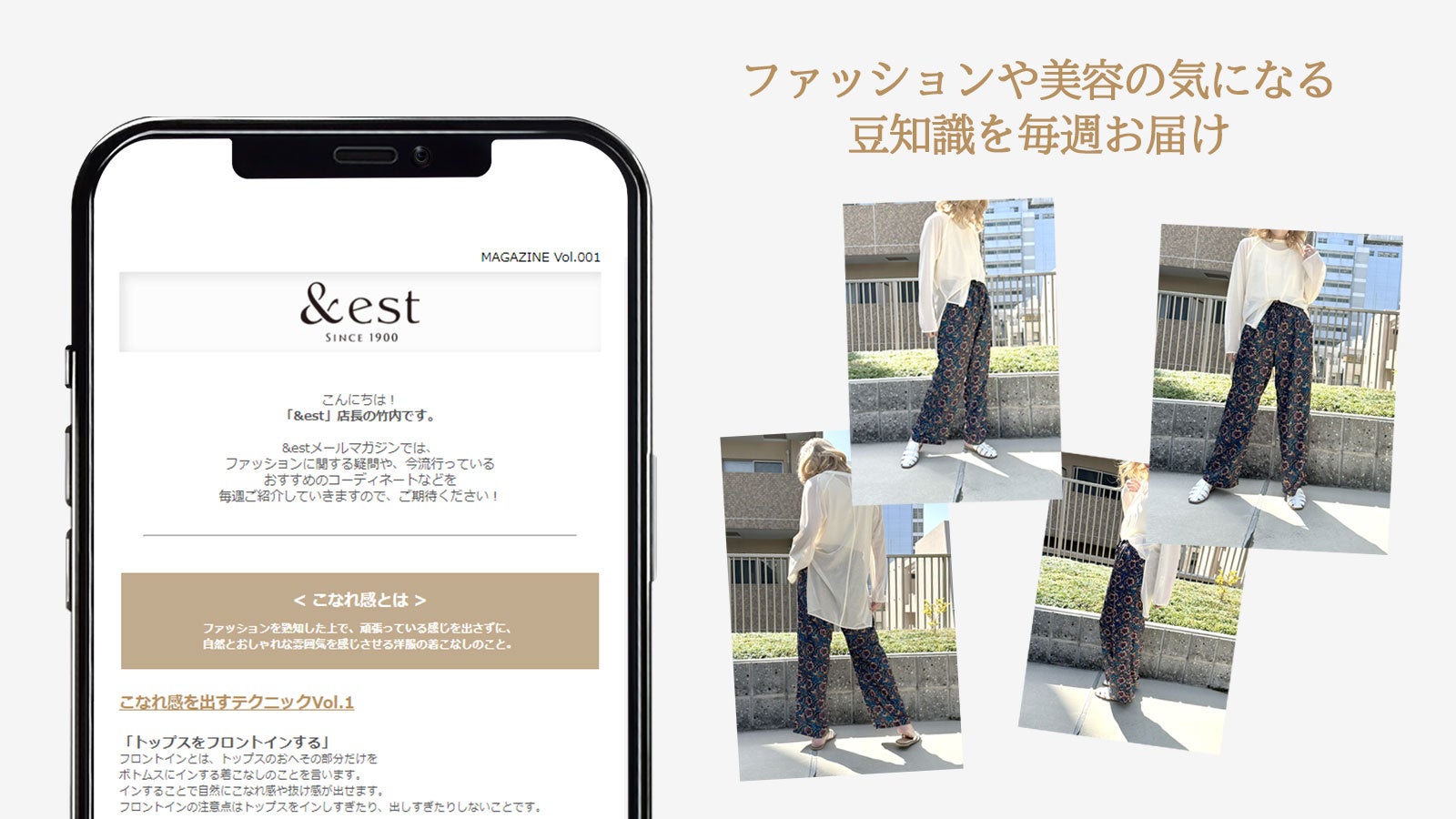自社オリジナル商品を中心としたライフスタイル通販サイト「&est-アンドエスト」では、日頃目にするファッションや美容に関するワードや流行についての意味や知識、おすすめのコーディネートやアイテムなどを毎週お届けするメールマガジンの配信を開始いたします。