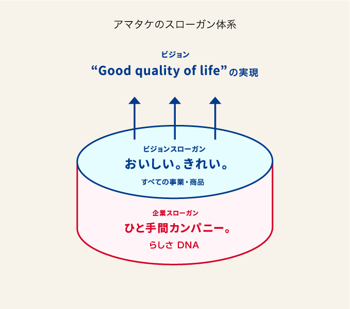 企業スローガン『ひと手間カンパニー。』を土台に、ビジョン『Good quality of life』、ビジョンスローガン『おいしい。きれい。』を掲げて企業活動をしてまいります。