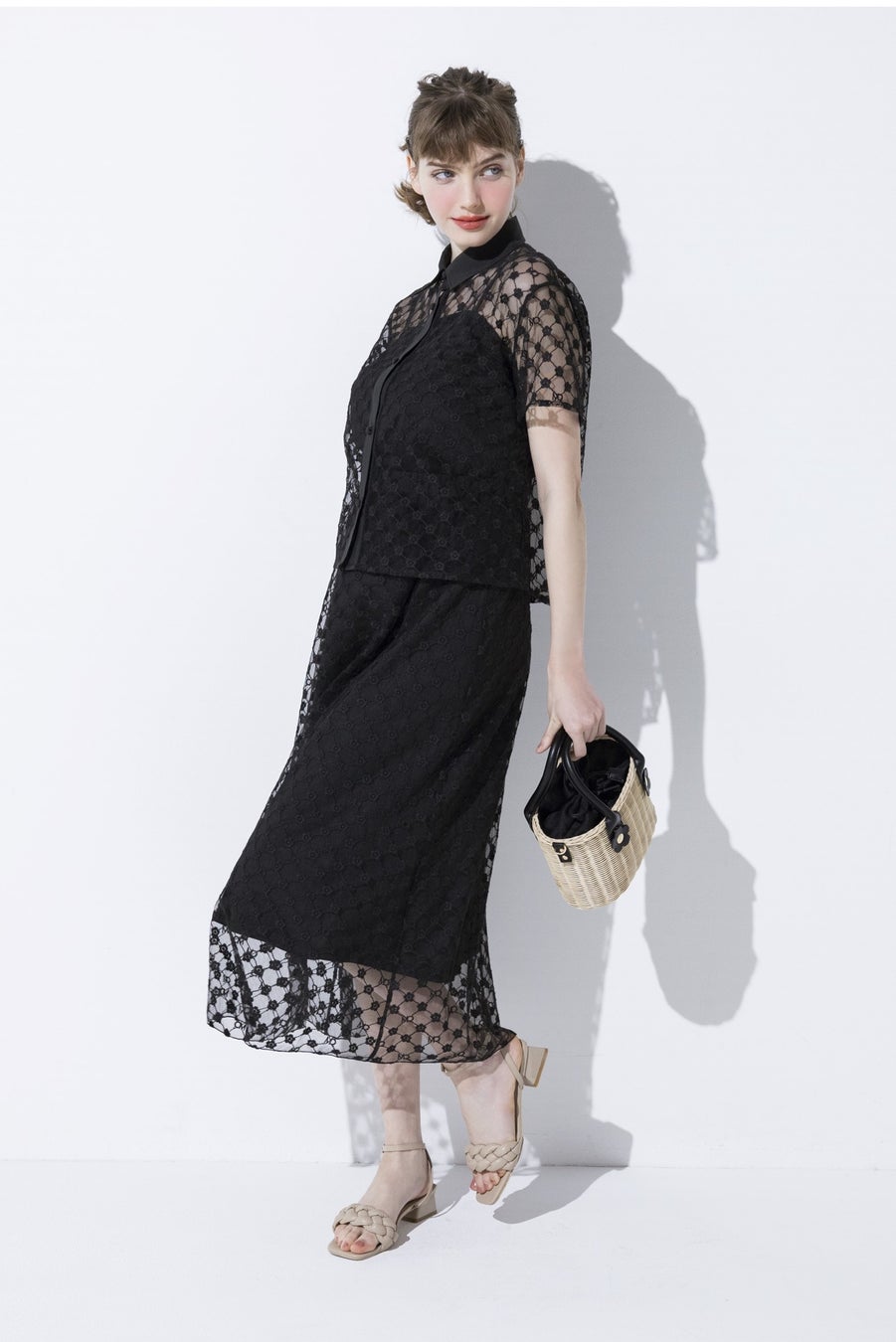 チュールレース素材が上品なモノグラムデザインのセットアップと、パールの持ち手がポイントのミニトートを合わせたコーディネート。