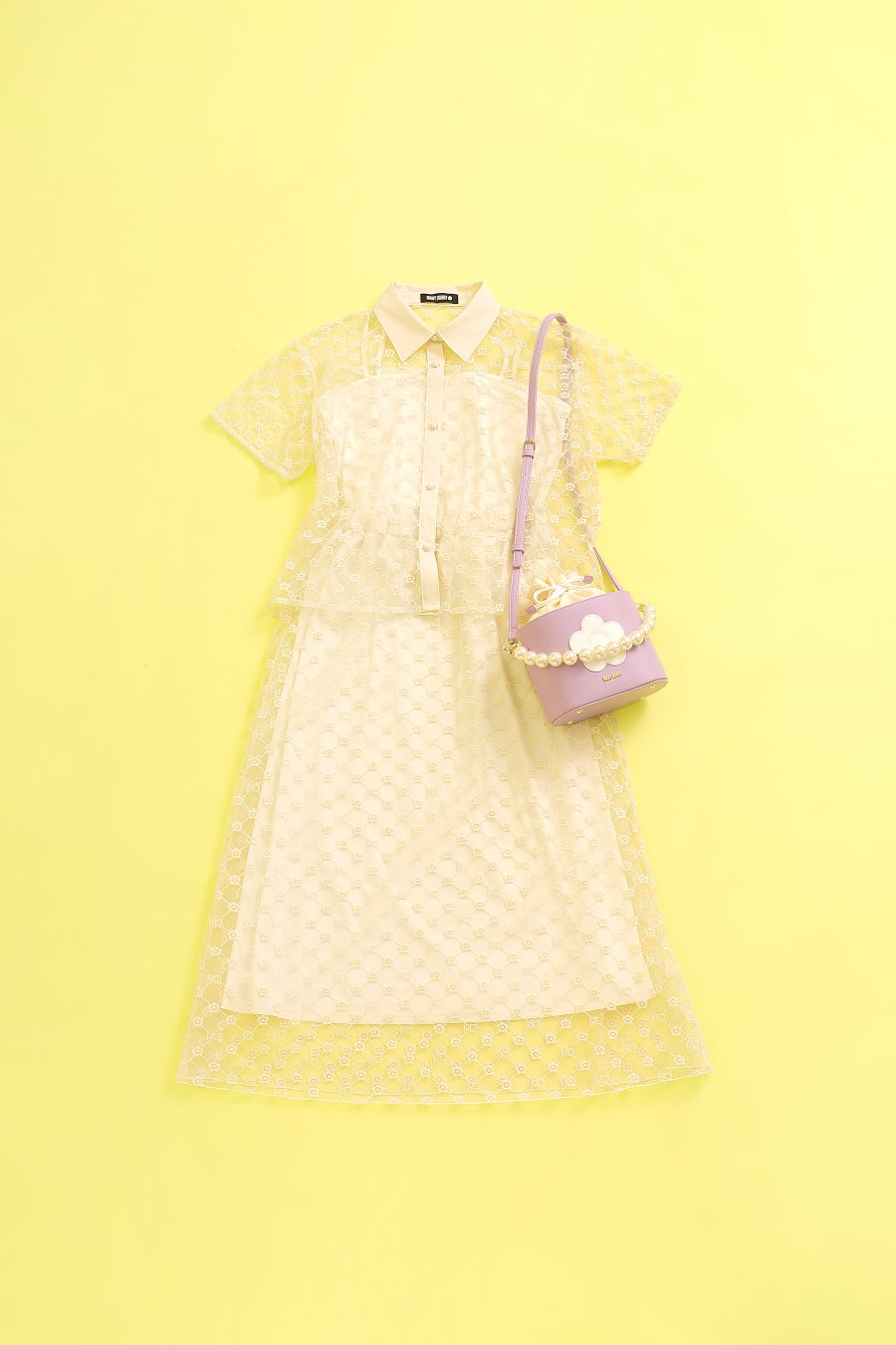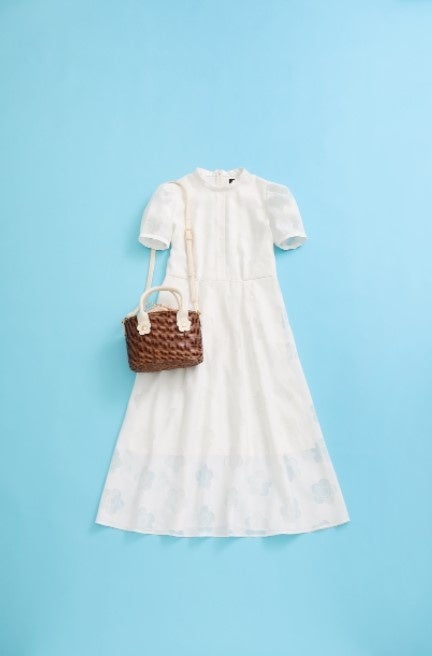 オパール加工のシアーワンピースと、夏らしいラタン素材のミニトートを合わせて。ワンピースのデイジーが夏の王道コーデにキュートさをプラスします。