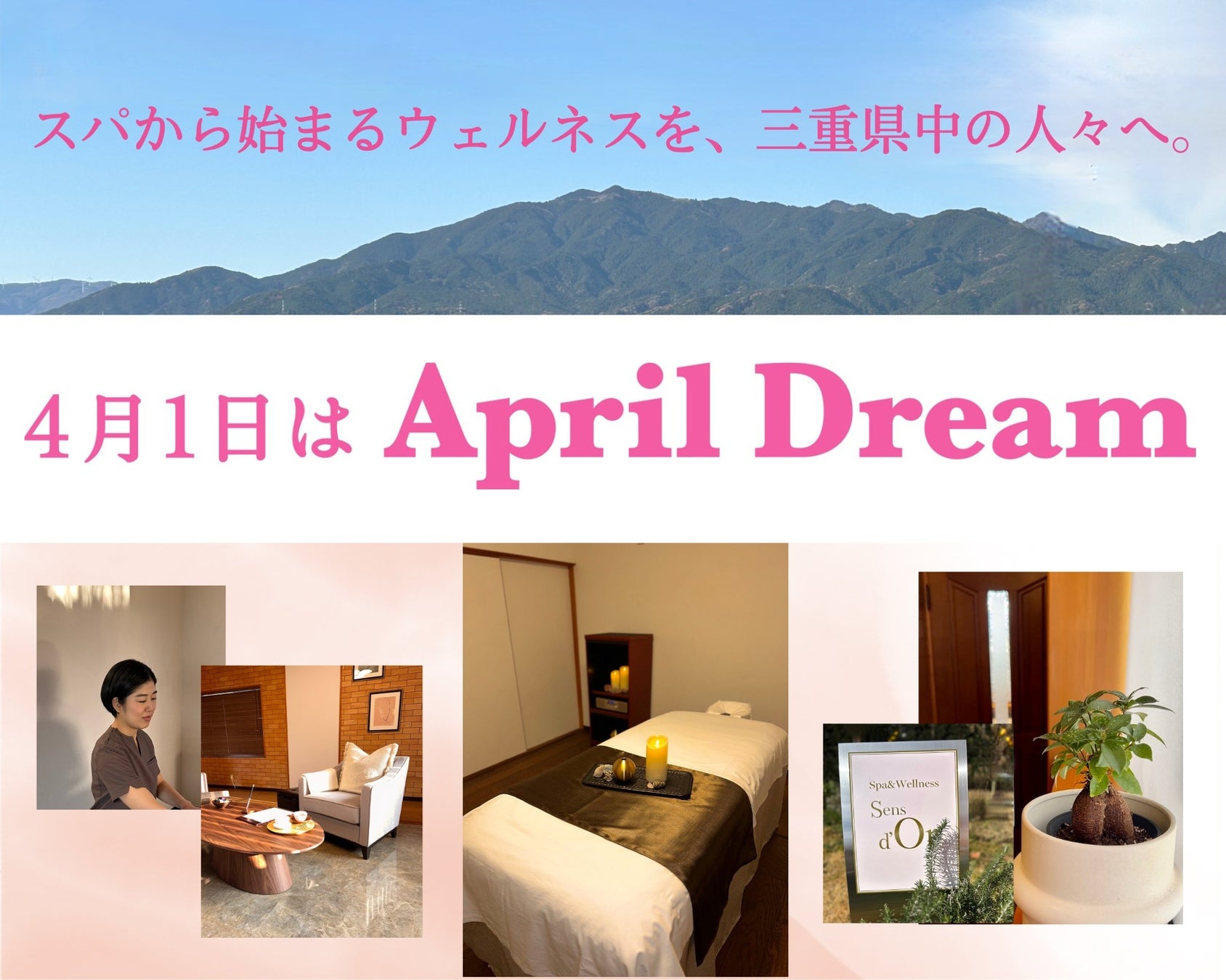 当社は、4月1日を夢を発信する日にしようとするApril Dreamに賛同しています。このプレスリリースは三重県津市の完全予約制プライベートスパ、「Spa&Wellness Sens d’Or(スパアンドウェルネス センスドール)」の夢です。