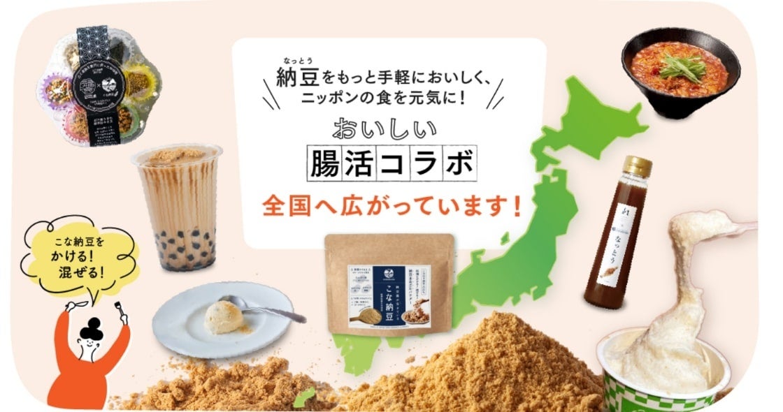 そのもの株式会社は、コロナ禍の中、飲食店を盛り上げたいという想いから、こな納豆を使った「#腸活飯プロジェクト」をスタートしています。いつものメニューに、腸活という健康効果をプラスしたスイーツをはじめとする多彩なコラボメニューが続々誕生しています。
