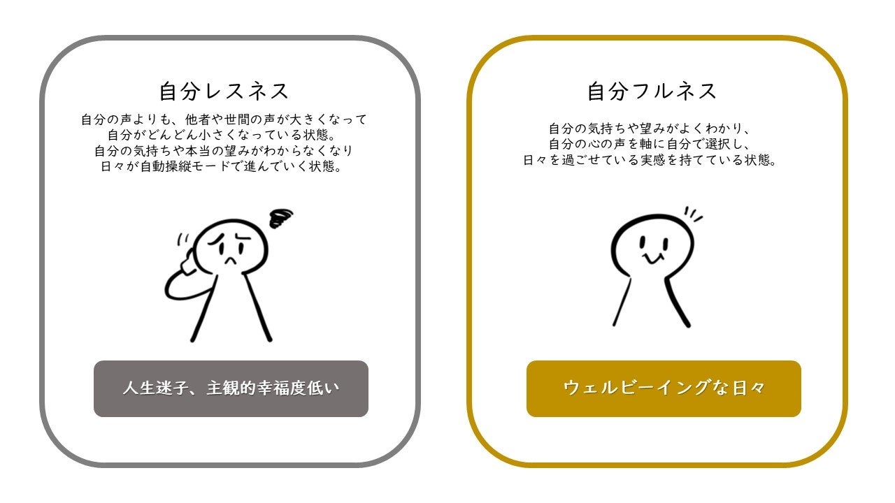 自分の気持ちや望みがよくわかり、自分の心の声を軸に自分で選択し、日々を過ごせている実感を持てている状態。 反対は自分レスネス。自分の声よりも、他者や世間の声が大きくなって、自分の気持ちや本当の望みがわからなくなり日々が自動操縦モードで進んでいく状態。LetterMeが独自に制定したオリジナルの言葉。