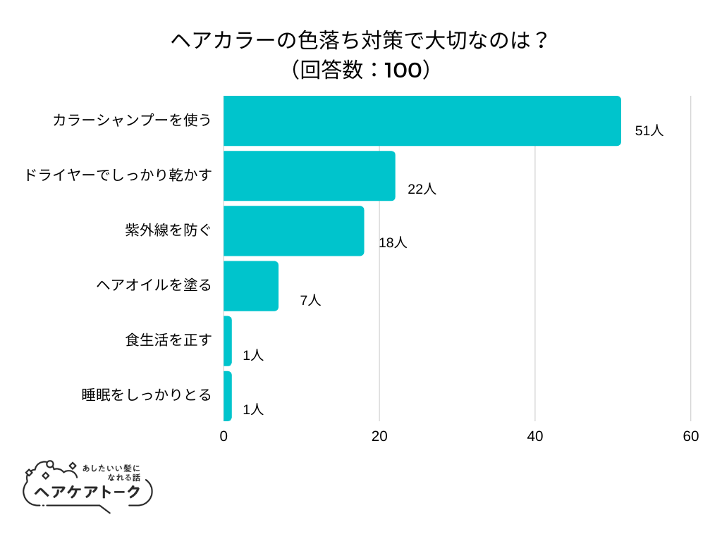 「ヘアカラーの色落ち対策で大切なのは?」とアンケート調査した結果、1位は『カラーシャンプーを使う』でした。