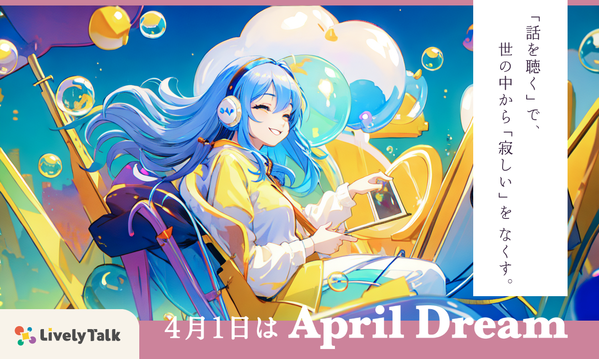 私たちは「話を聴く」ことで、世の中から「寂しい」が無くなる未来が待っていると信じています。そんな当社は、4月1日を夢を発信する日にしようとするApril Dreamに賛同しています。このプレスリリースは「株式会社Lively」の夢です。