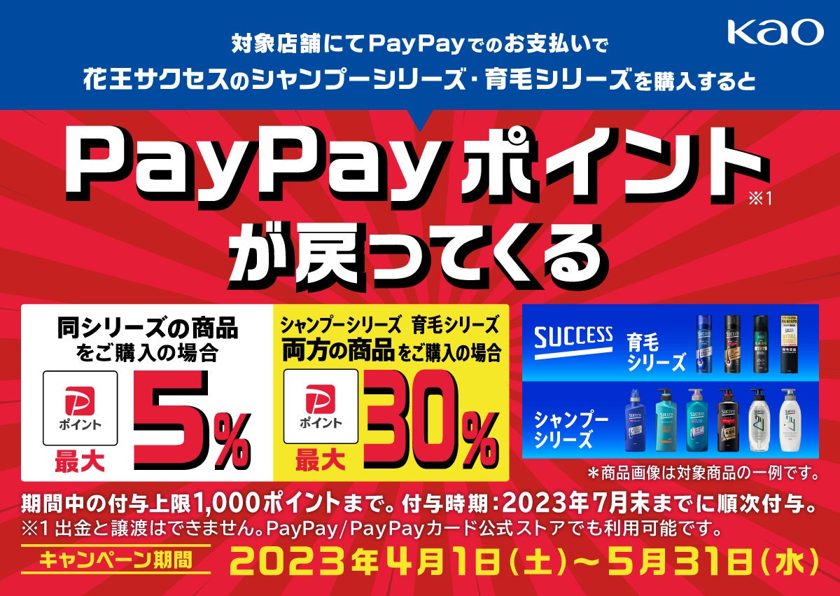 花王のトータルメンズケアブランド「サクセス」は、「サクセス」の製品をご愛顧いただいているお客様への感謝の気持ちを込め、サクセスシャンプーシリーズ&育毛シリーズのセット購入でPayPayポイント(※1)が最大30%戻ってくるキャンペーンを実施いたします。