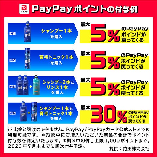 キャンペーン期間内でシャンプーシリーズの商品のみ購入の場合、対象商品のお買い上げ金額に対して最大5%のPayPayポイントを後日付与します。同じく期間内で育毛シリーズの商品のみ購入の場合、対象商品のお買い上げ金額に対して最大5%のPayPayポイントを後日付与します。さらに期間内でシャンプーシリーズの商品と育毛シリーズの商品の両方を購入の場合、対象商品のお買い上げ金額に対して最大30%のPayPayポイントを後日付与します。(2023年7月までの順次付与予定)