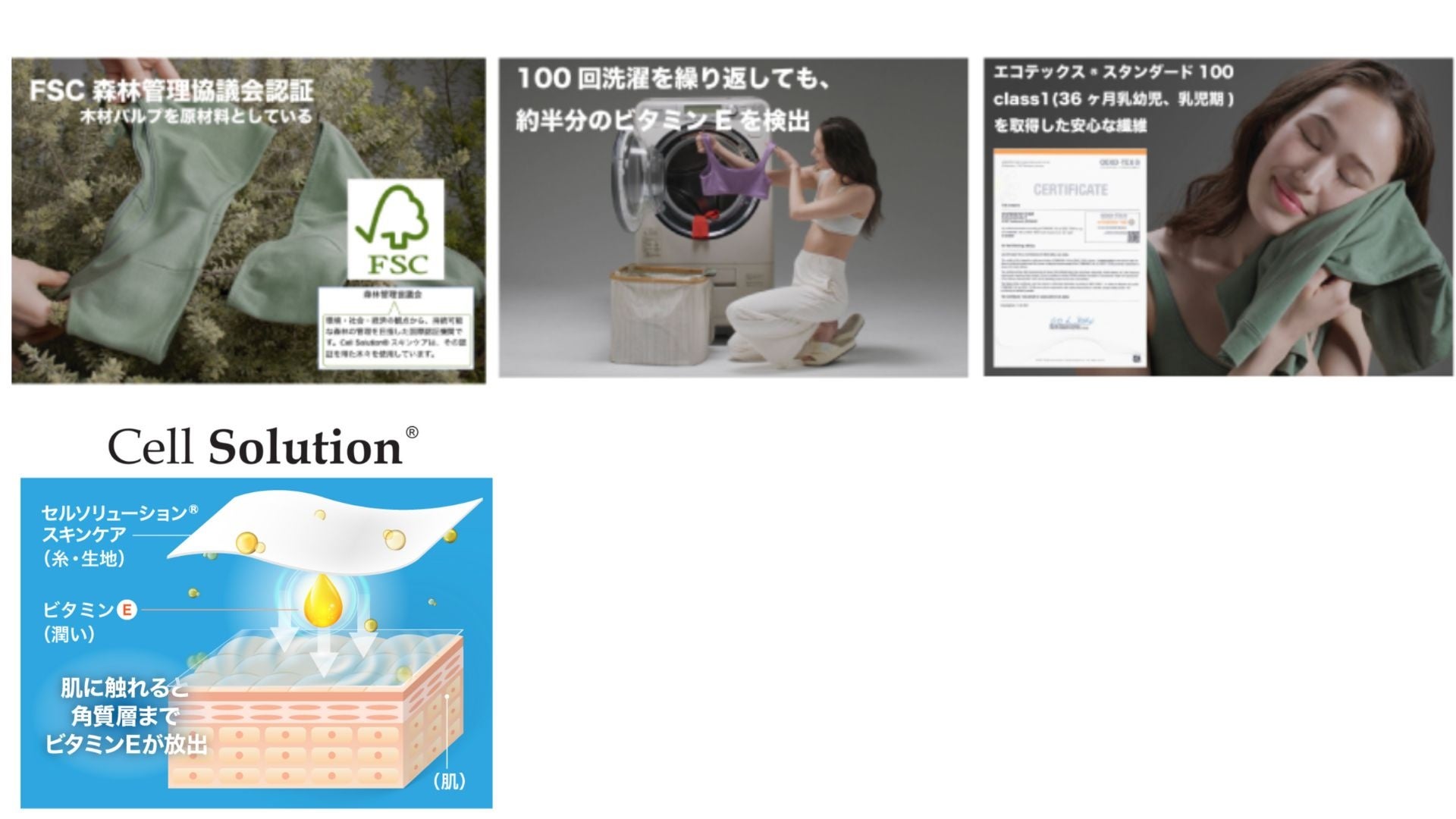 「Cell Solution」は、FSC(適切な森林管理を認証する国際的な制度)認証のユーカリの木を原料とした天然由来の新繊維です。糸の製造過程で美容成分のビタミンE(整肌作用)を配合しており、肌着として着用すると生地と肌の摩擦によってビタミンEが放出され、肌を潤し、紫外線で傷んだ肌や乾燥肌を保湿ケアしてくれる繊維です。