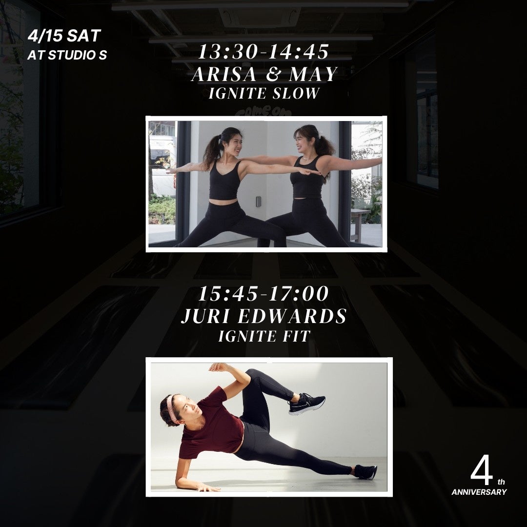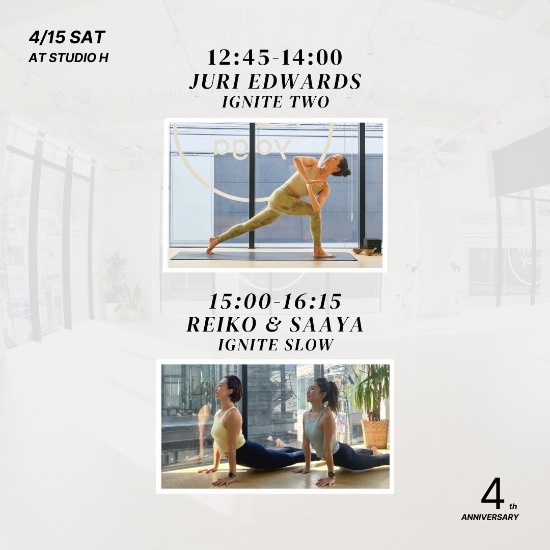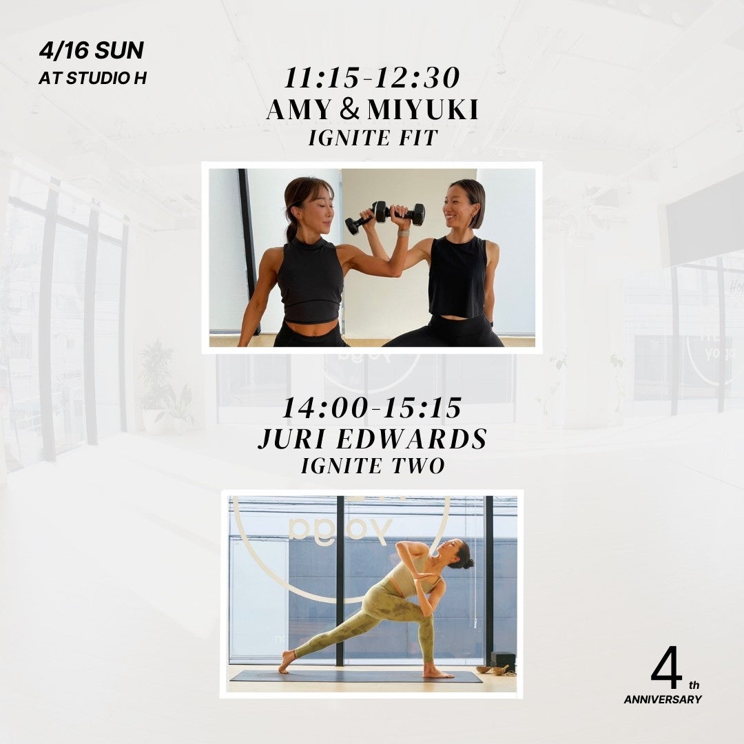 株式会社IGNITE(本社:東京都渋谷区神宮前5-16-13 Six Harajuku Terrace 2F 代表取締役:エドワーズ壽里)が運営する「IGNITE YOGA STUDIO」は、2023年4月14日(金)に”studio h”がオープン4周年、”studio s”がオープン1周年を迎えるのを祝して、4月15日(土)・16日(日)にスペシャルイベントを開催いたします。