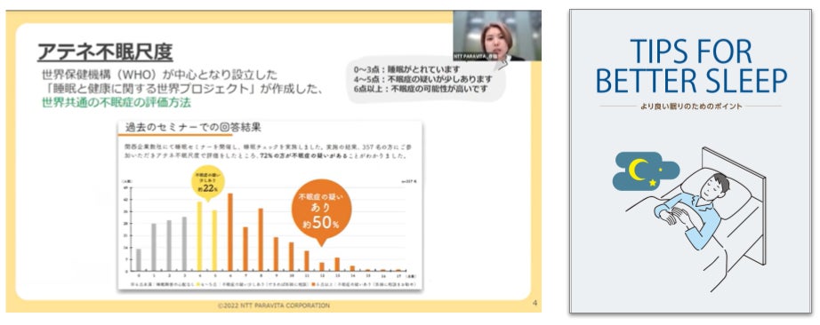 ◆セミナーの冒頭で参加者それぞれの不眠度合を確認できる世界共通の不眠症の判定方法「アテネ不眠尺度」を実施。睡眠に問題がある方もそうでない方も、ご自身の睡眠状況を客観的に把握することで、より良い睡眠につなげていただくことが可能です。