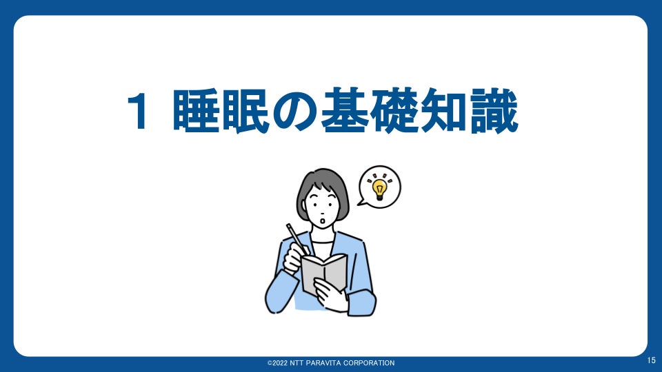 ねむりのDXカンパニーNo.1をめざすNTT PARAVITA株式会社(大阪市 代表取締役社長:中野 康司、以下「NTT PARAVITA」)は、2023年4月13日(木)・18日(火)・21日(金)に「働き世代向け睡眠セミナー:学校では教えてくれない睡眠の話(新年度に緊張して眠れない時の睡眠法を伝授)」を開催します。(先着100名限定)新年度である4月は、人事異動や昇進など様々な環境変化による緊張・ストレスから眠れない人が増えやすい時期。今回のセミナーでは、精神的な不安・緊張から眠れない日が続いている働き世代の皆さまにおすすめの睡眠法を伝授します。(参加者限定特典あり)