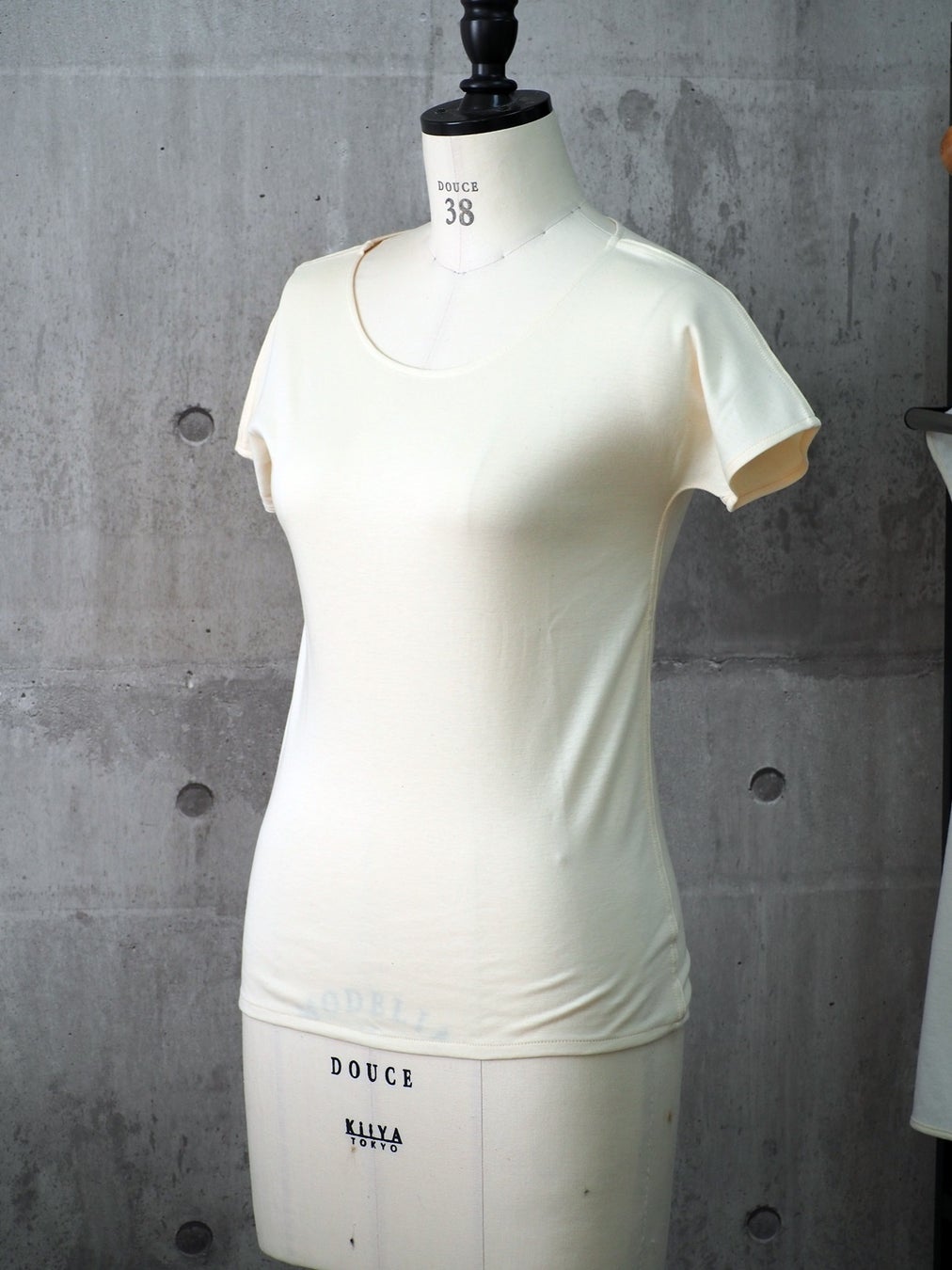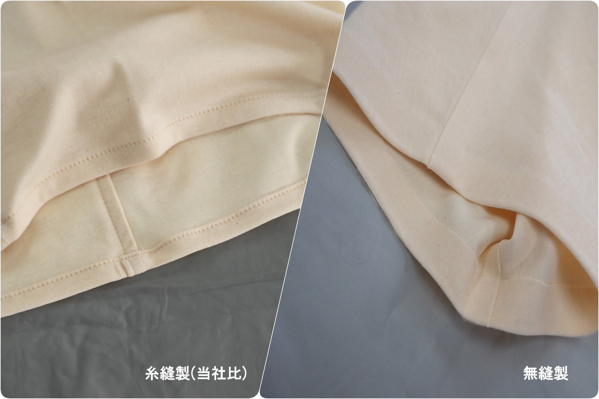 生地にはオーガニックテキスタイル世界基準(GOTS)の認証を受けた糸のみを使い、肌触りに徹底して配慮し自社開発したオリジナル生地を使用しています。さらに特殊機械で糸を使わずに生地を合わせ肌への当りを極限まで低減した、ストレスフリー肌着となっています。