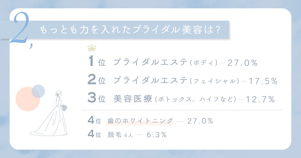 また、やらずに後悔したブライダル美容に関する調査では、歯のホワイトニングが1位に。
