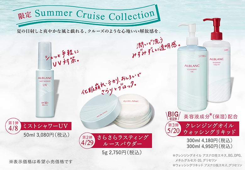 2004年の誕生以来「潤いに満ちた透明感ある明るい肌」を理想とし、“人が気づく美しさ”にこだわってきた「ALBLANC(アルブラン)」から、夏の日射しと爽やかな風と戯れる、クルーズのような心地いい解放感をテーマにした限定商品~サマークルーズ コレクション~が登場。第1弾として、アルブラン初となるミストタイプの日やけ止めアイテム、『アルブラン ミストシャワーUV』を、2023年4月8日(土)より数量限定で発売いたします。