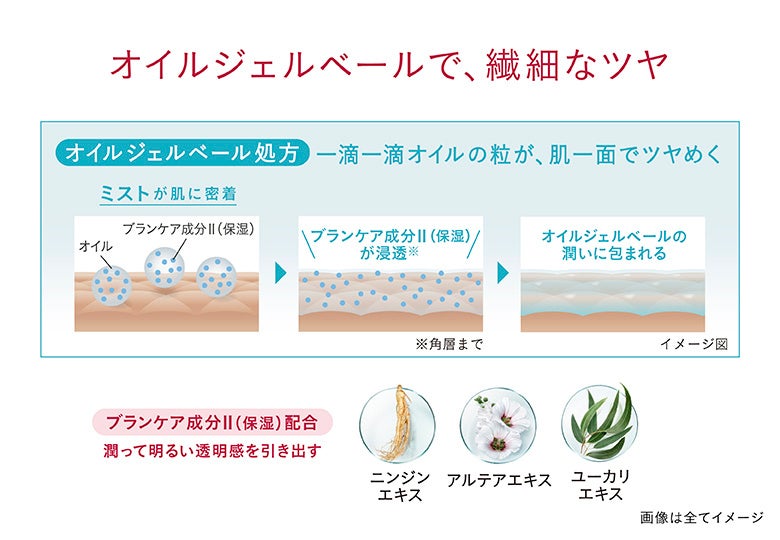 ミストに含まれるアルブラン独⾃の保湿成分であるブランケア成分Ⅱを含んだオイルの⼀滴⼀滴の粒が、密着。肌⼀⾯をオイルジェルベールで包み込むように肌の乾燥を防ぎながら、紫外線から守ります。