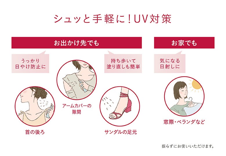 透明のミストタイプで、服に色移りせず、またノンガスタイプで使いやすさにこだわったミストです。衣服の隙間や首の後ろ、足元などにシュッとひと吹きすれば、日常のうっかり日やけも防止できます。バックの中に入れて持ち歩きやすく、お出かけ先でもシュッとこまめにケアすることができます。またご自宅で窓際・ベランダに出る際の日射しが気になるときにも、ご使用いただけます。