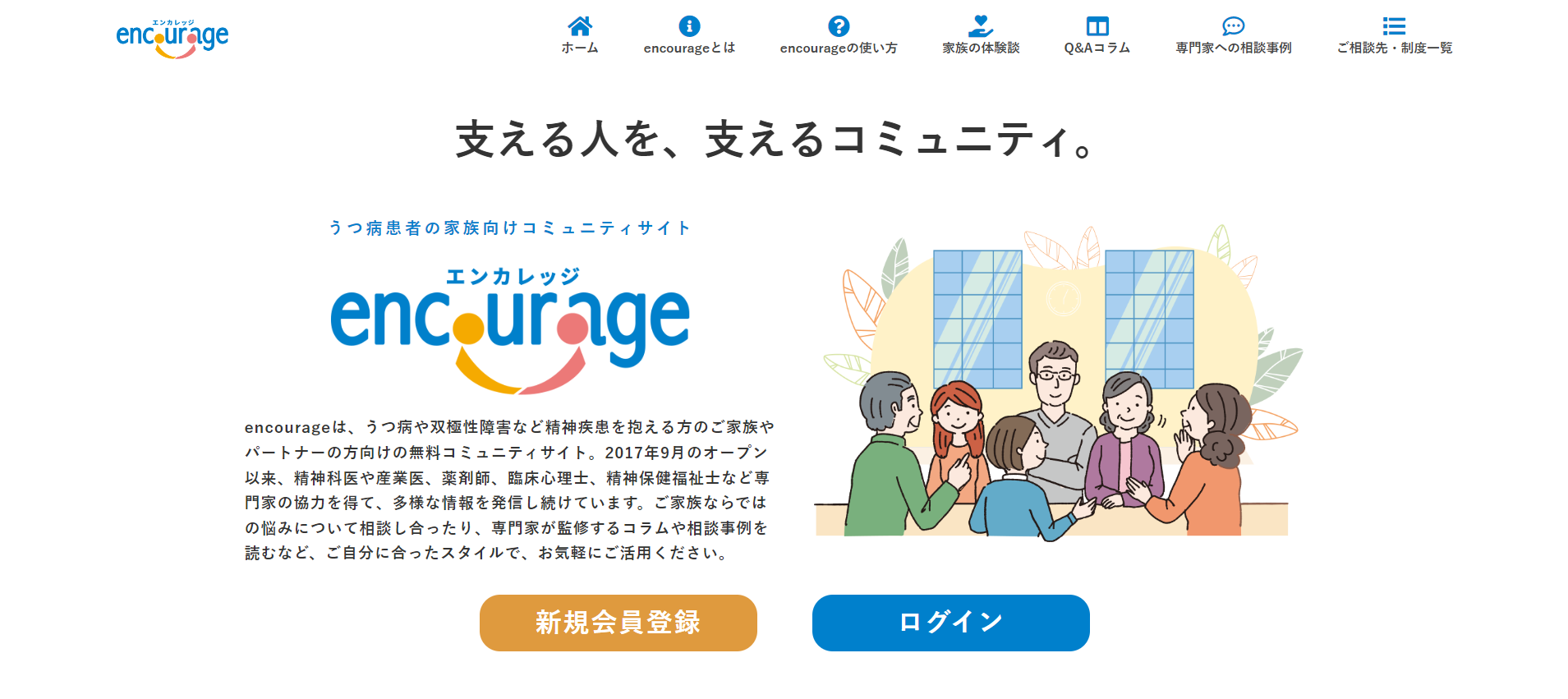 encourageは、うつ病や双極性障害など精神疾患を抱える方のご家族やパートナーの方向けの無料コミュニティサイトです。2017年9月のオープン以来、精神科医や産業医、薬剤師、臨床心理士、精神保健福祉士など専門家の協力を得て、多様な情報を発信し続けています。ご家族ならではの悩みについて相談し合ったり、専門家が監修するコラムや相談事例を読むことができます。