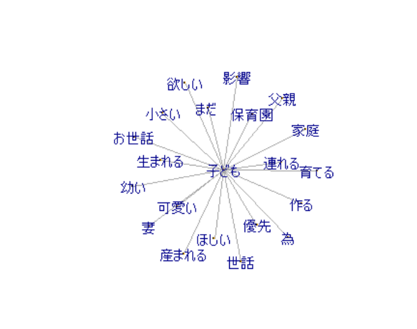 子どもに関するコメントのみを抜粋し、関連するワードをもとにしたマップを作成すると、「育てる」「保育園」「世話」のような育児に関するコメントと、「作る」「生(産)まれる」「ほしい」といった出産や子作りに関するコメントの2つの傾向が明らかになりました。