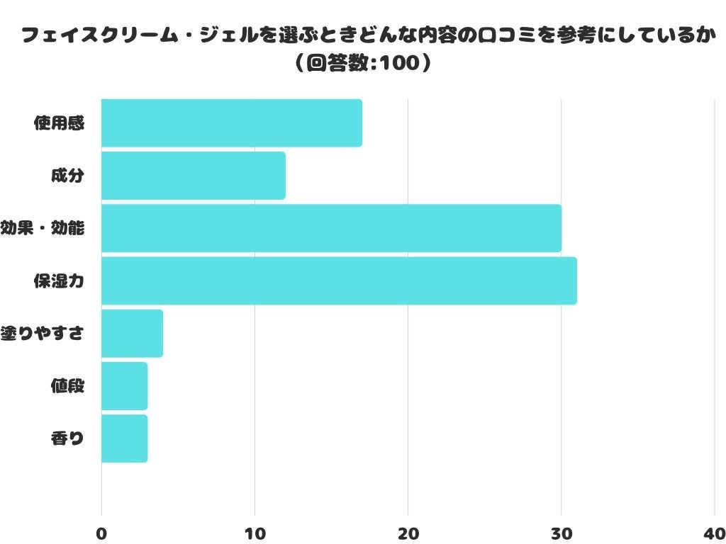フェイスクリーム・ジェルのどんな内容の口コミを参考にするをアンケートにて調査したところ、1位は「保湿力」 でした。
