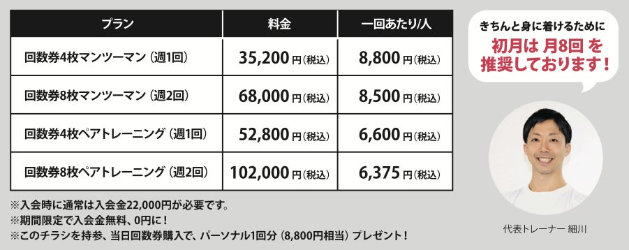 さらに、オープン特典として入会金22,000円が無料、回数券1回分(8,800円相当)をプレゼントキャンペーン中です(2023年5月31日までの期間限定。無料体験当日に回数券をご購入いただいた方に限ります)。