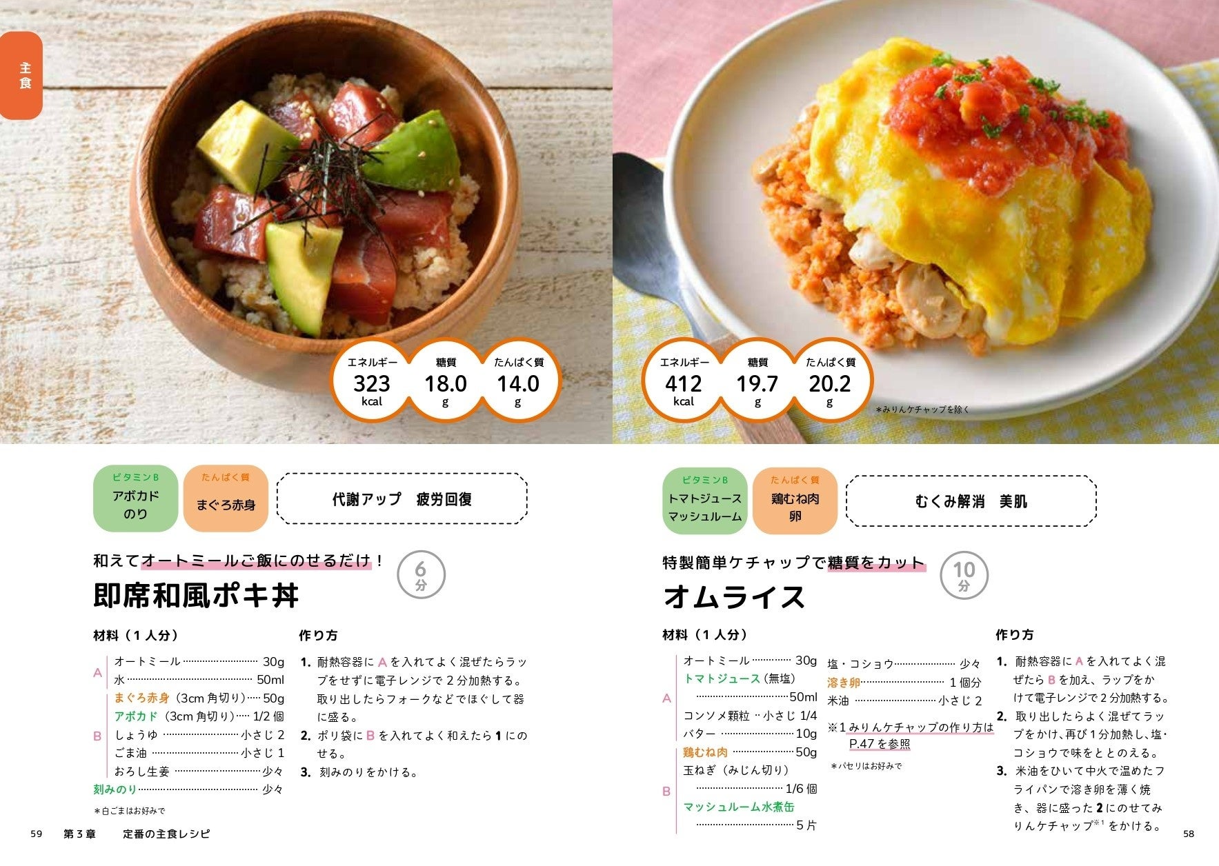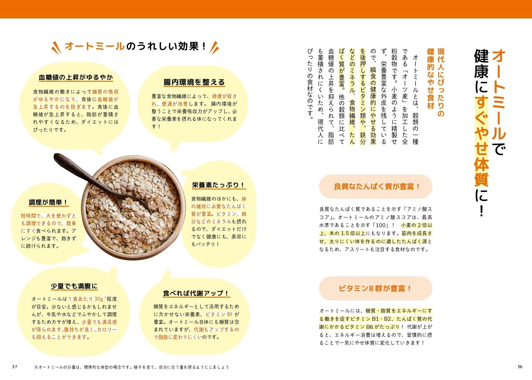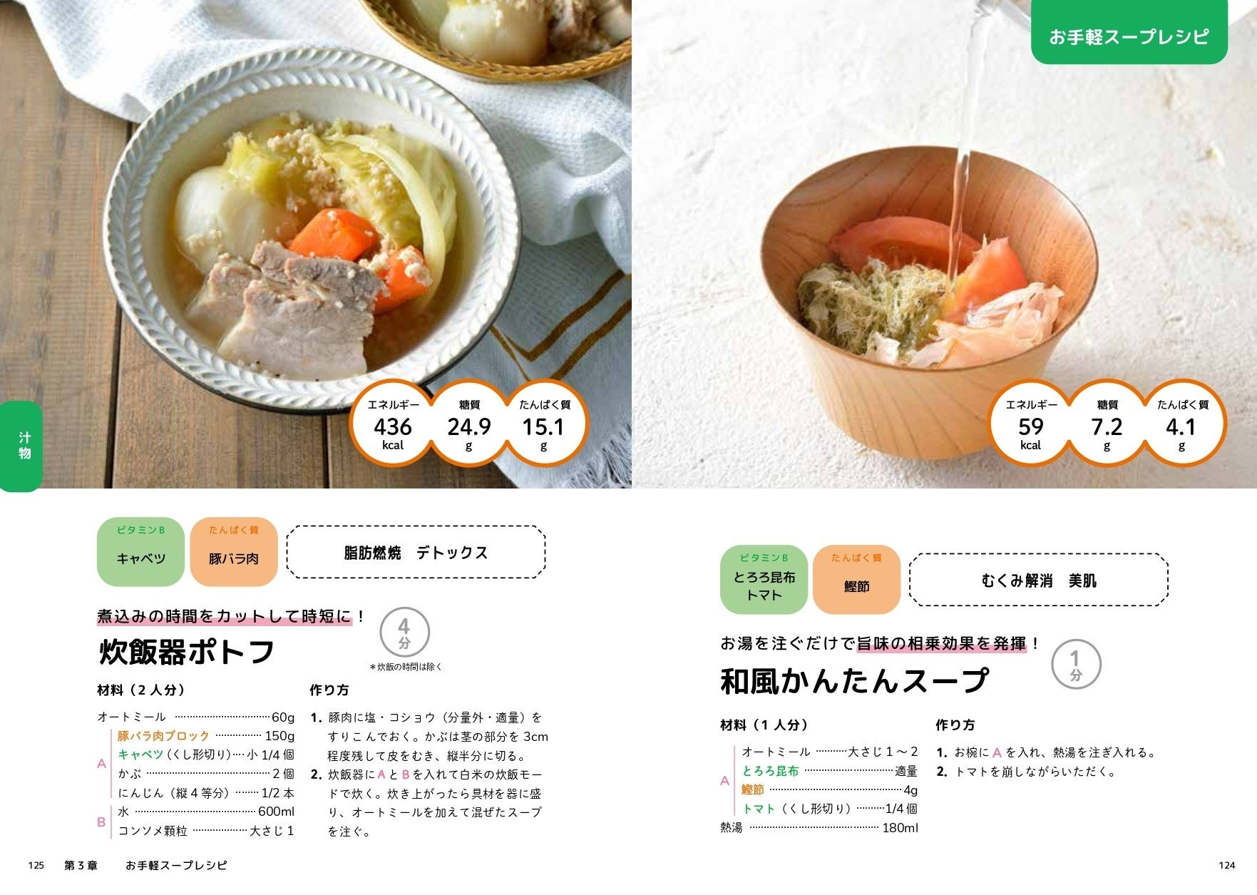 “瞬食”とは松田リエさんが提唱する、「すぐに実践できてやせる食習慣」のこと。たんぱく質とビタミンB群を意識した食材選びや、ずぼらでも続けられる時短食材の活用などを推奨。本書はそんな“瞬食メソッド”と相性の良いオートミールを使った主食・おかず・汁もの・デザートなどのレシピが満載です。