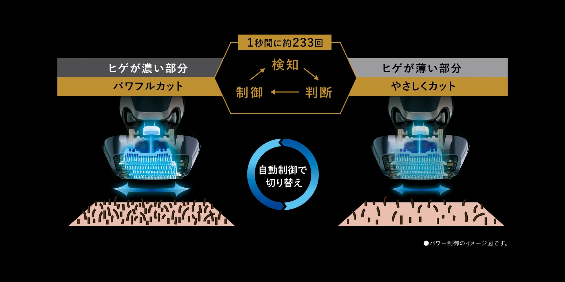 「ラムダッシュAI+(※3)」がヒゲの濃さを検知し、ヒゲが濃い部分ではハイパワーモードでパワフルにシェービング、ヒゲの薄い部分ではやさしくカットします。検知精度の向上で、より変化を感じやすくなりました。