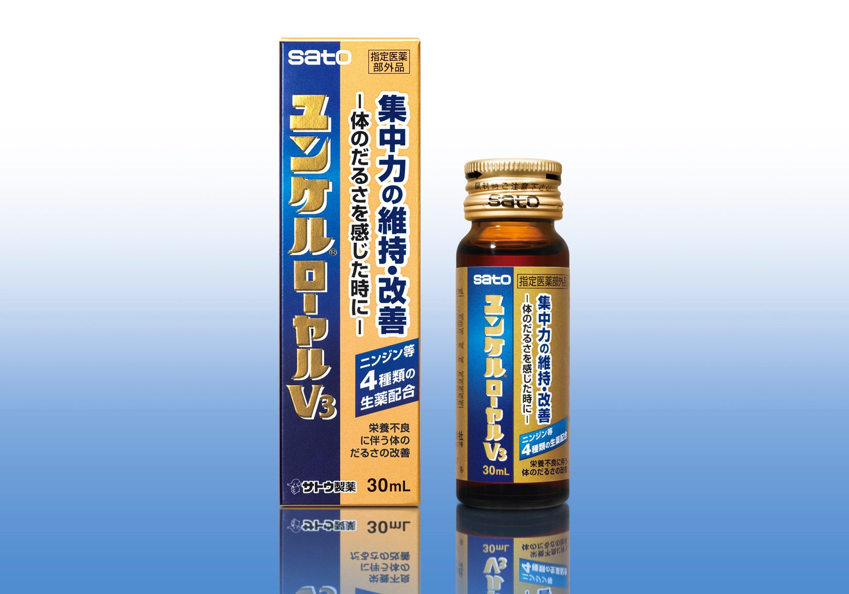 『ユンケルローヤルV3』は、疲れた時の栄養補給にコンビニエンスストアで買えるユンケルとしてご愛顧いただいております『ユンケルローヤルV2』の処方を強化した栄養ドリンク剤です。植物性生薬のニンジン流エキス1,000㎎をはじめ、セイヨウサンザシエキス、ブクリョウエキス、ローヤルゼリーの4種類の生薬に加え、従来品と比べてビタミンB2とB6を2倍量配合しております。