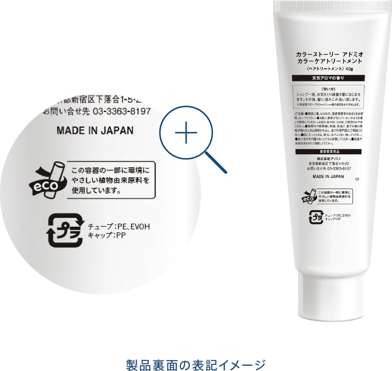 自社基準をクリアし、環境に配慮した容器には、『アリミノ エコバトンマーク』を付け、誰でもひと目でわかるようにすることで、私たちに関わるすべての方たちと環境に対する意識を高め、共有していきたいと考えています。バトンには次世代への継承を、ゴールテープには未来の目標に向かって邁進する姿を表現しています。