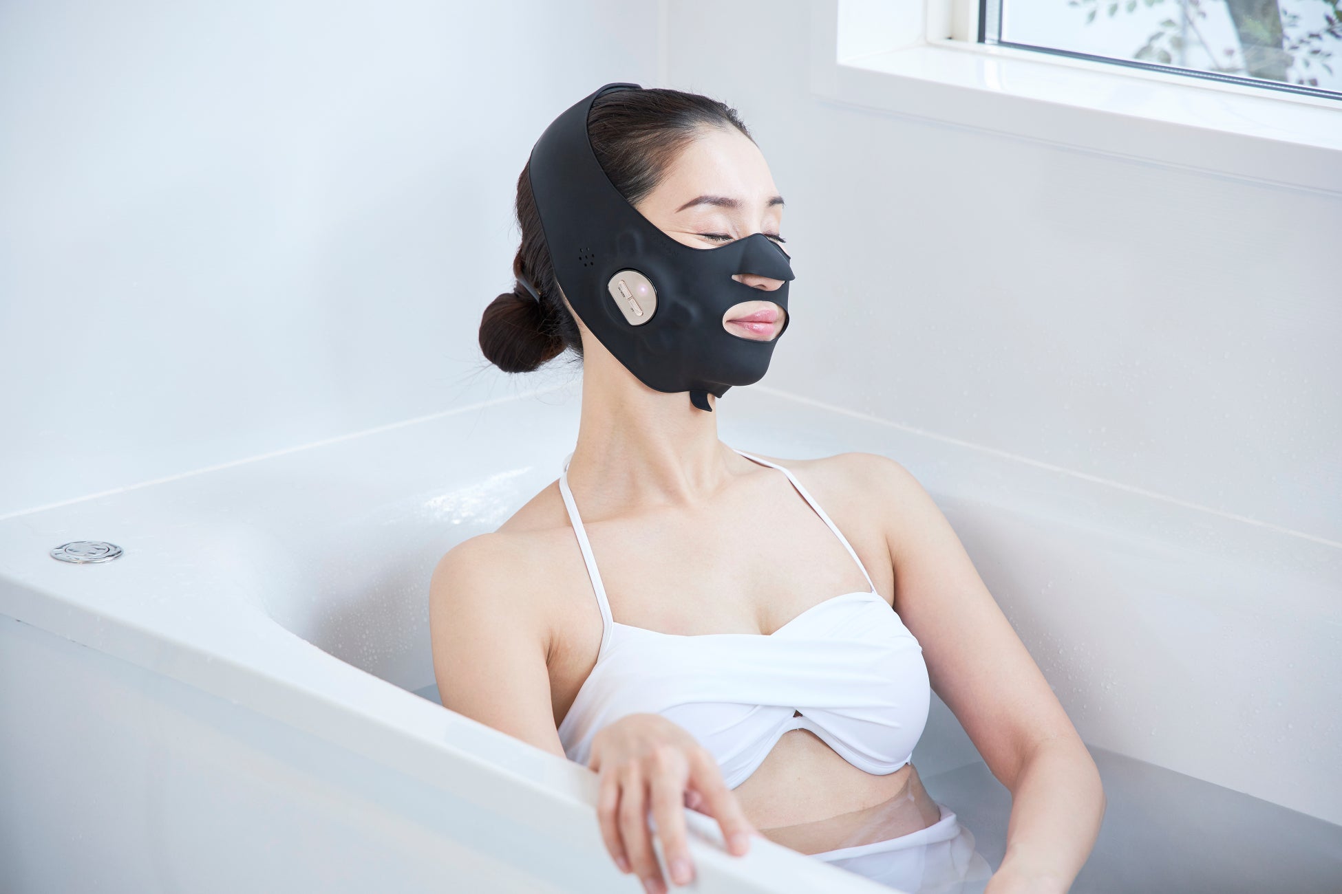一部オンラインストアにて先行発売しておりましたが、お客さまの生活ルーティンに合わせ、よりケアの選択肢を増やしていただきたいという思いから、ラインアップ拡大としてお風呂でも表情筋ケアが出来る防水モデル*1のウェアラブルEMS美顔器『メディリフト アクア EX』を店頭でも販売開始いたします。ワンタッチ装着でフェイスラインをしっかりホールドし、筋肉の温まった状態に効率よくトレーニング出来るモードを搭載することで、お風呂で効率的なリフトケア*3を叶えます。