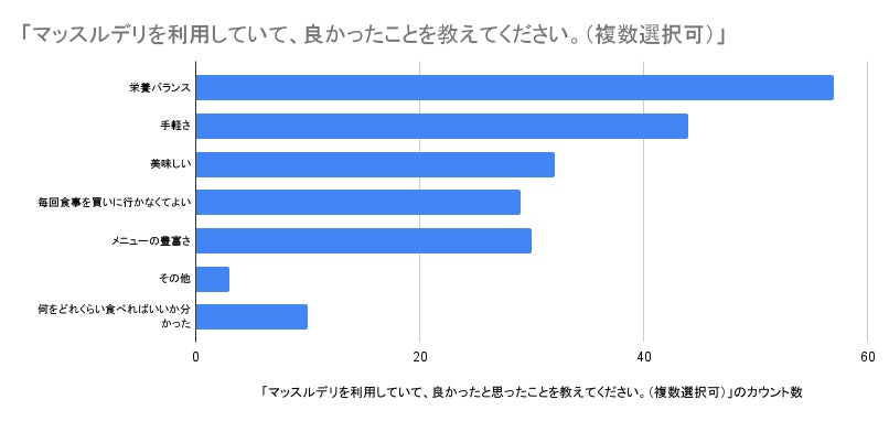 なお、「マッスルデリを利用していて、良かったと思ったことを教えてください。(複数選択可)」という問いに対して、「高タンパク低カロリーな栄養バランス」と答えた人が84.3%と最も多く、次いで「手軽さ」(66.1%)、「美味しい」(48%)と続きました。