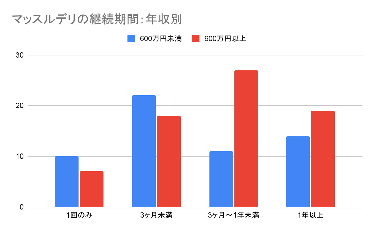 - マッスルデリの継続期間も年収600万円以上の方が高い結果に