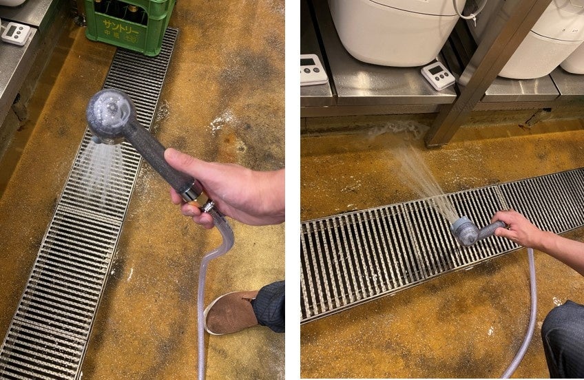 ミラブルプロダイナーには2種類あり、シンクタイプは厨房シンクの水栓に幅広く取り付けられる工法に対応するファインバブル吐水ヘッドで、様々なタイプの厨房でご利用いただける製品です。一方のデッキタイプは、ホースによる床洗浄等への利用が可能なファインバブル吐水ヘッドです。