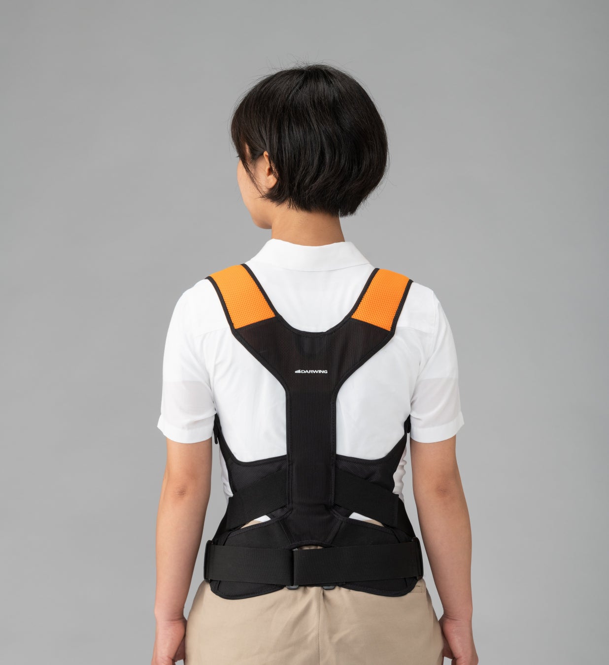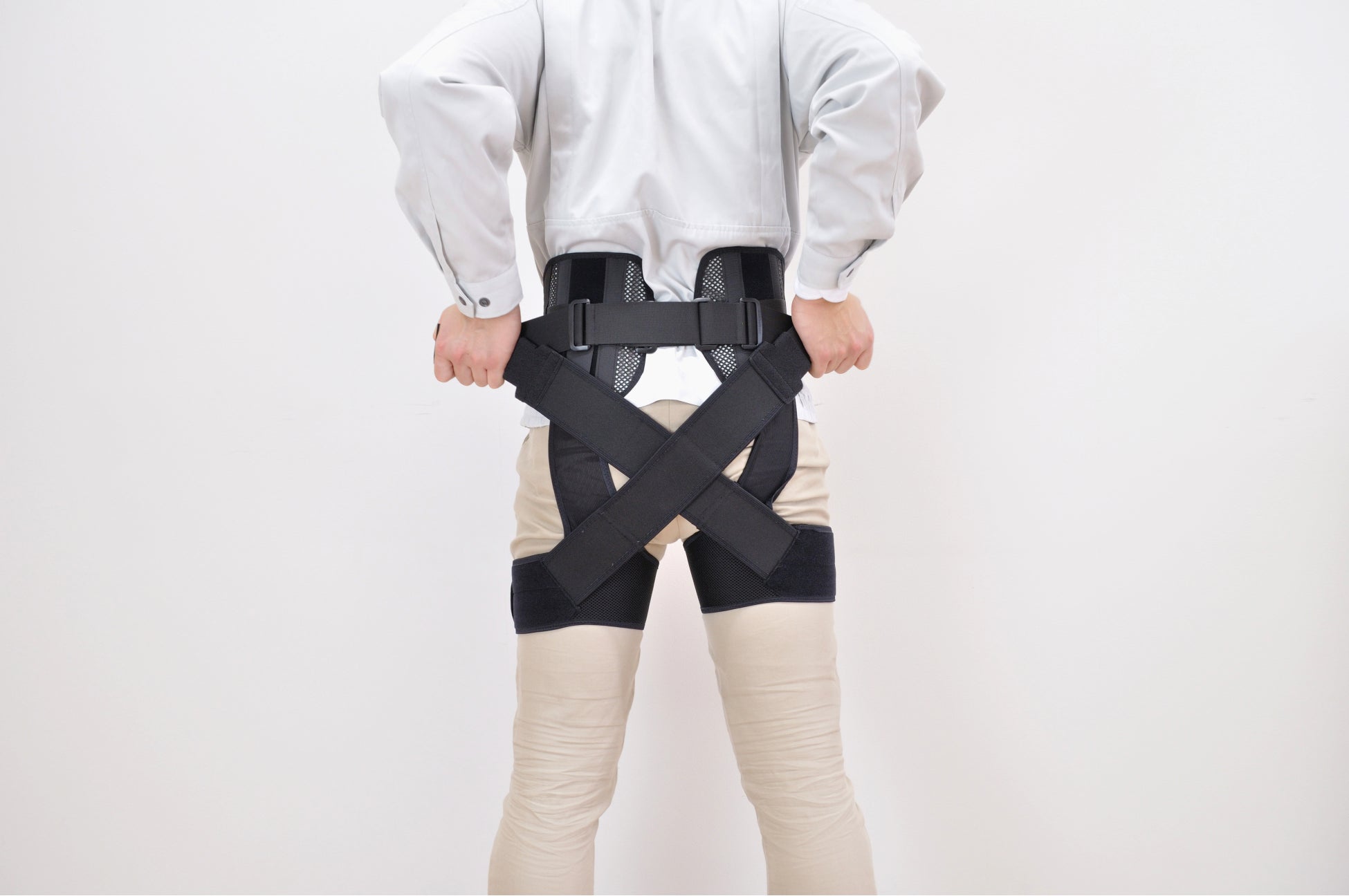 骨盤のコルセット機能と背中のアシスト機能で、作業現場の中腰姿勢、前屈動作をサポートするアシストスーツです。