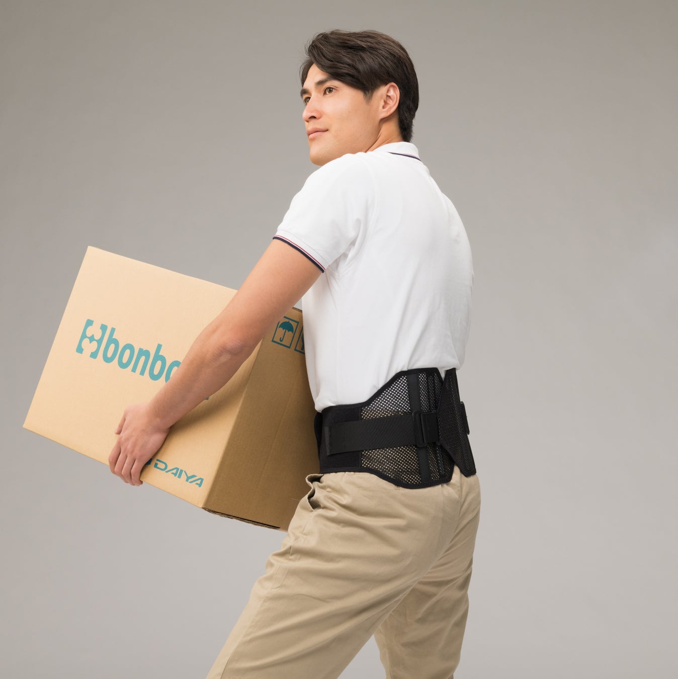 背部のアシスト機能とコルセット機能で持ち上げ作業をサポートするアシストスーツです。装着することで腰への負担がかかりにくい持ち方にアシストします。