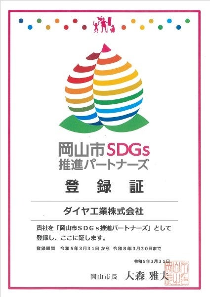 医療用品メーカーのダイヤ工業株式会社(本社:岡山県岡山市 代表取締役:松尾浩紀)は、岡山市が定める「岡山市SDGs推進パートナーズ制度」でSDGsに取り組む事業者として、2023年3月31日付で「岡山市SDGs推進パートナーズ」に登録されました。今後、「岡山市SDGs推進パートナーズ」として、持続可能な社会の実現を目指し継続した取り組みを行ってまいります。