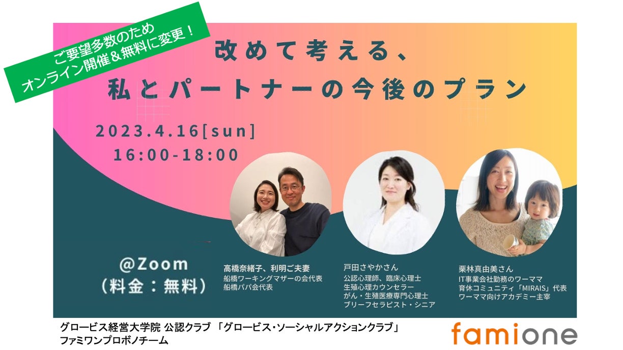 「子どもを願うすべての人によりそい 幸せな人生を歩める社会をつくる」をビジョンに掲げ、LINEを活用した妊活コンシェルジュサービス「famione(ファミワン)」 https://lp.famione.com/ を提供する株式会社ファミワン(本社:東京都渋谷区、代表取締役:石川勇介)は、グロービス経営大学院の公認クラブ「グロービス・ソーシャルアクションクラブ」が主催するSACプロボノチャレンジの伴走先団体としてプロボノ支援を受けており、今回、プロボノチームとの共催で「改めて考える、私とパートナーの今後のプラン」~先輩・専門家に学ぶこれからの人生の課題解決のヒント~と題し、妊活をはじめとするキャリアプランニングにおけるパートナーとのコミュニケーションをテーマにセミナーを開催致します。https://famione-probono.peatix.com/view