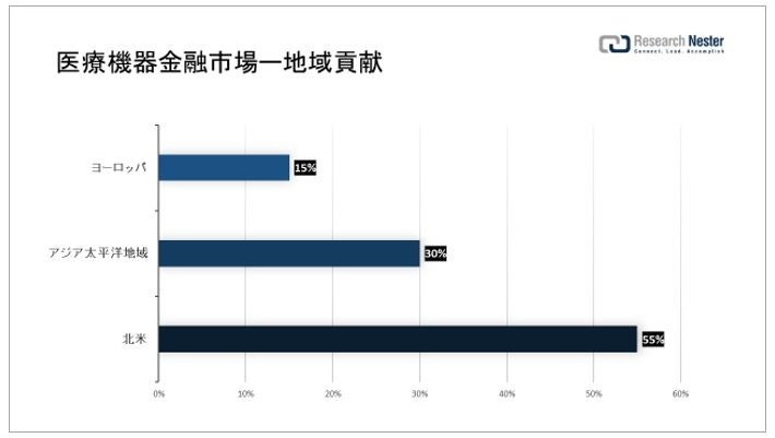 北米地域の医療機器融資市場シェアは、他のすべての地域の市場の中で最大であり、2033 年末までに約 40% になると予測されています。市場の成長は、主に医療費の増加と、それに続く地域の病院の医療ベッド数の急増に起因する可能性があります。Center for Medicare and Medicaid Services によると、米国の国民医療費は 2020 年に 9.7% 増加し、4.1 兆米ドルに達し、国の GDP の約 19.7% に達しています。さらに、2019 年には地域病院に約 800,000 のベッドがあり、そのうち約 60,000 が内科手術の集中治療ベッドです。これに加えて、ポータブル人工呼吸器、透析機器、ICU 機器などの治療機器の必要性の高まりと、医療診断機器向けの金融サービスの増加も、予測期間中に北米地域の市場成長をさらに高めると推定されています。