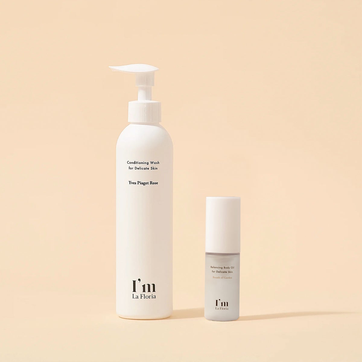 ブランドローンチ当初から一番人気の”デリケートボディウォッシュ”と、デリケートゾーンはもちろん髪やネイルにも使えるマルチさが支持を集めている”バランシングボディオイル”がセットになった「やわ肌セット」は、2種類の香りが楽しめるセット。
