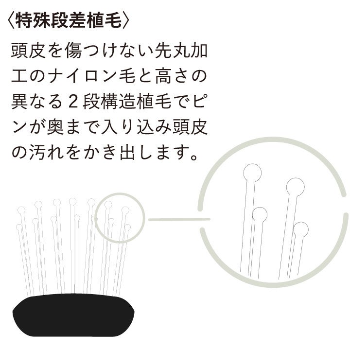特殊な段差植毛により、ブラシピンが髪と頭皮にやさしくフィット。程よい硬さのピンが毛穴の汚れをかき出し、頭皮からリフレッシュ。