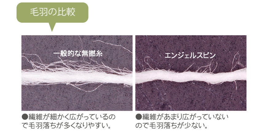 天然コットン100%を使用し毛羽落ちが少なく、洗濯するたび羽のようにふんわりした肌触りがよみがえります。