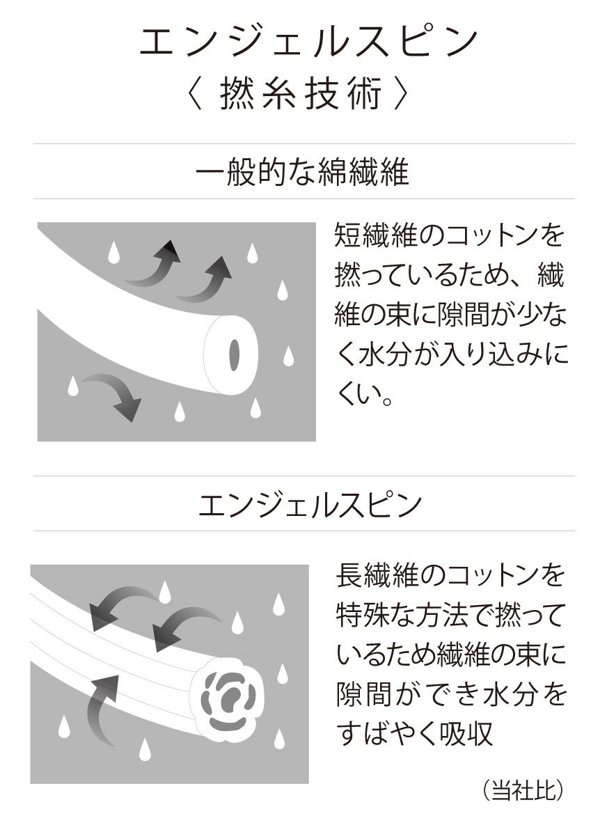 日本2大産地の”泉州タオル”の特殊技術「エンジェルスピン」を採用しているため、糸の中にたっぷり含んだ空気の層が髪の水分をすばやく吸収。洗濯するほどふわふわになるエンジェルタッチの肌触りが特徴です。