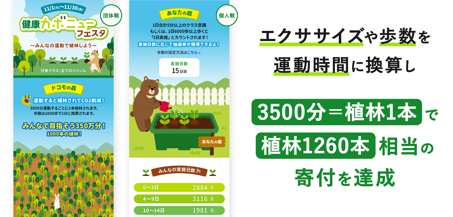 実施目標:エクササイズ3,500分を植林1本相当として換算し、期間合計1,000本相当の寄付達成