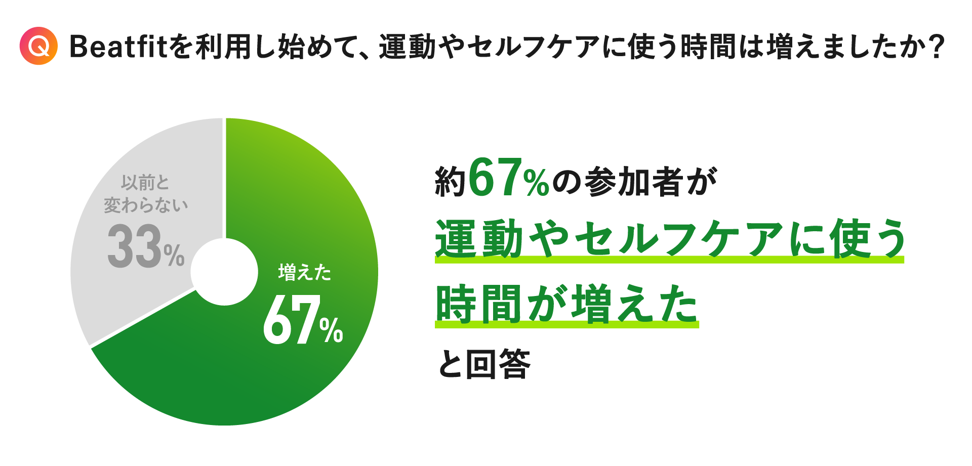 また、運動やセルフケアに費やす時間が増えたと回答した参加者が約70%以上を占めました。イベントが日々の運動のきっかけになったと考えられ、目的の1つであった運動の習慣化促進にも繋がったと考えています。