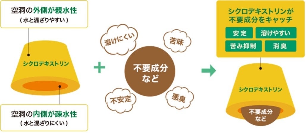 不要成分をキャッチするというユニークな特徴を有するため、医薬品添加物や日用品、化粧品などに応用されています。また、シクロデキストリンがキャッチした不要成分は、体内に吸収されることなく体外に排出されるため、サプリメントや健康食品にも利用されています。