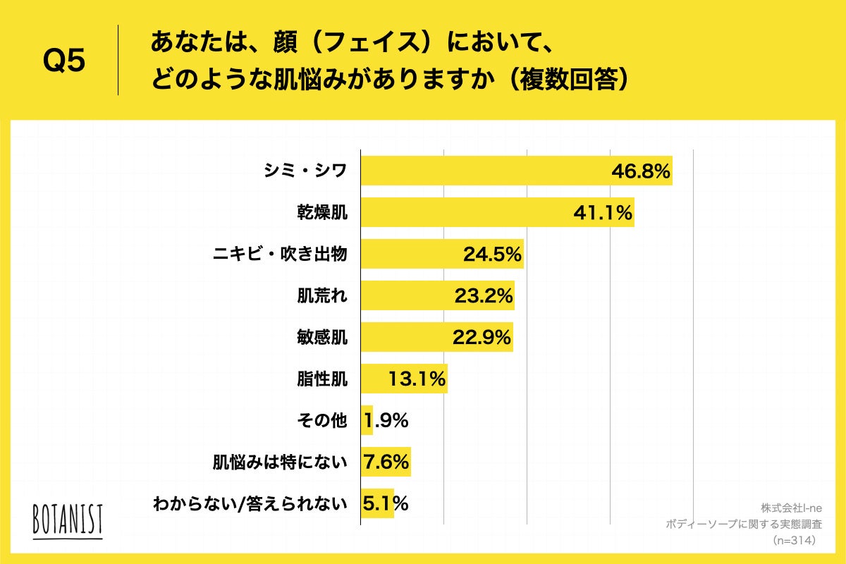 「Q5.あなたは、顔(フェイス)において、どのような肌悩みがありますか(複数回答)」(n=314)と質問したところ、「シミ・シワ」が46.8%、「乾燥肌」が41.1%、「ニキビ・吹き出物」が24.5%という回答となりました。