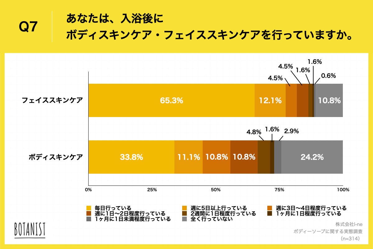「Q7.あなたは、入浴後にボディースキンケア・フェイススキンケアを行っていますか。」(n=314)と質問したところ、フェイススキンケアは、「毎日行っている」が65.3%、「週に5日以上行っている」が12.1%、ボディースキンケアは、「毎日行っている」が33.8%、「週に5日以上行っている」が11.1%という回答となりました。